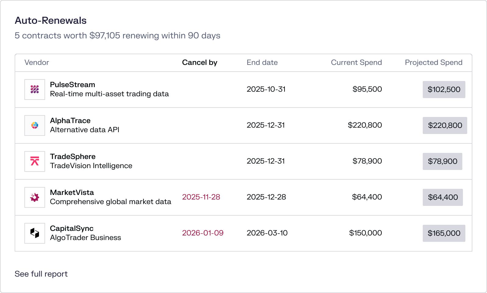 Every renewal and cancel-by date in one place