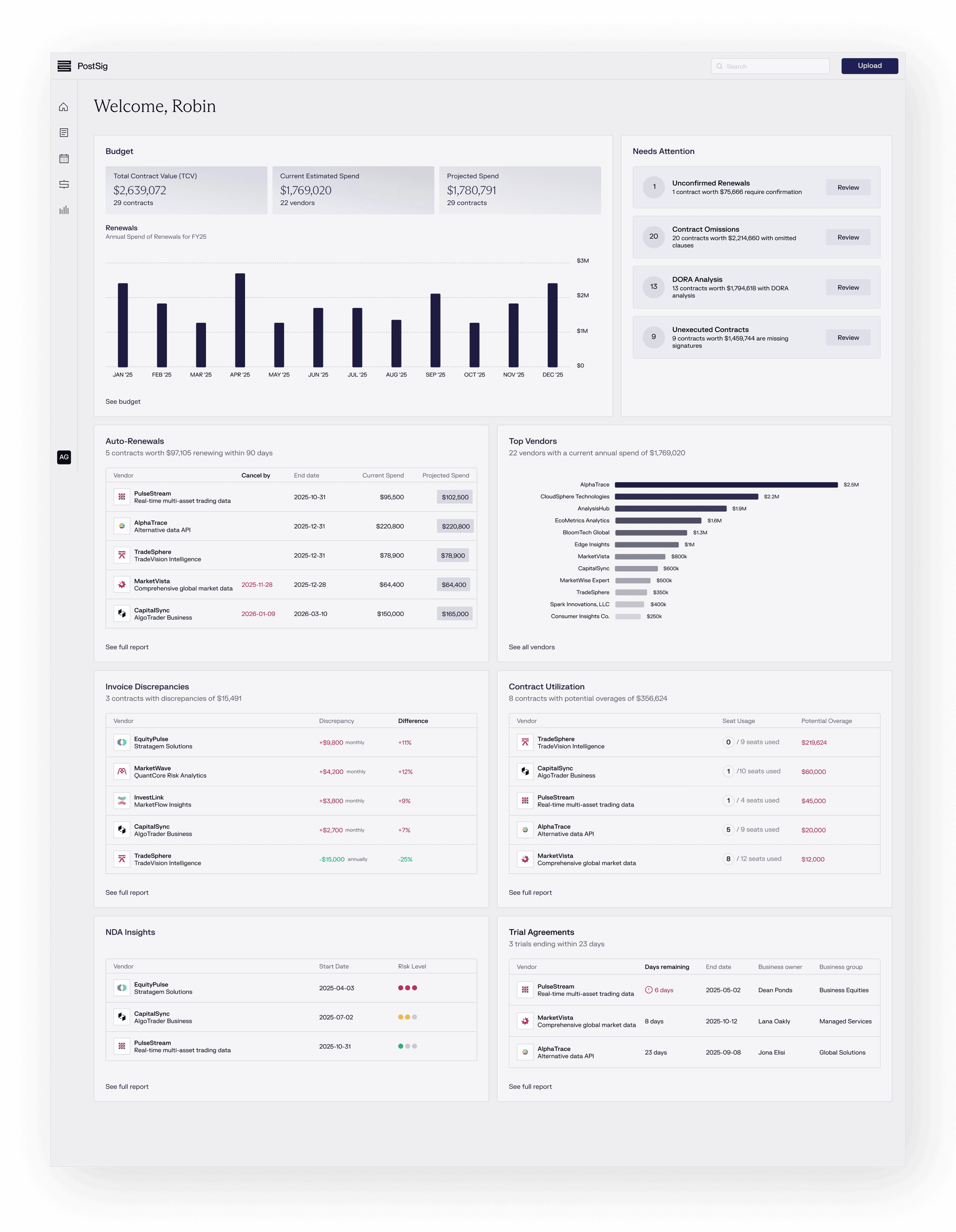 Contracts determine spend, risk, and leverage. When terms change and visibility lags, budgets drift, renewals surprise, and negotiation power erodes. PostSig keeps contractual reality visible with continuous contract inteligence, so financial outcomes stay intentional, not accidental.