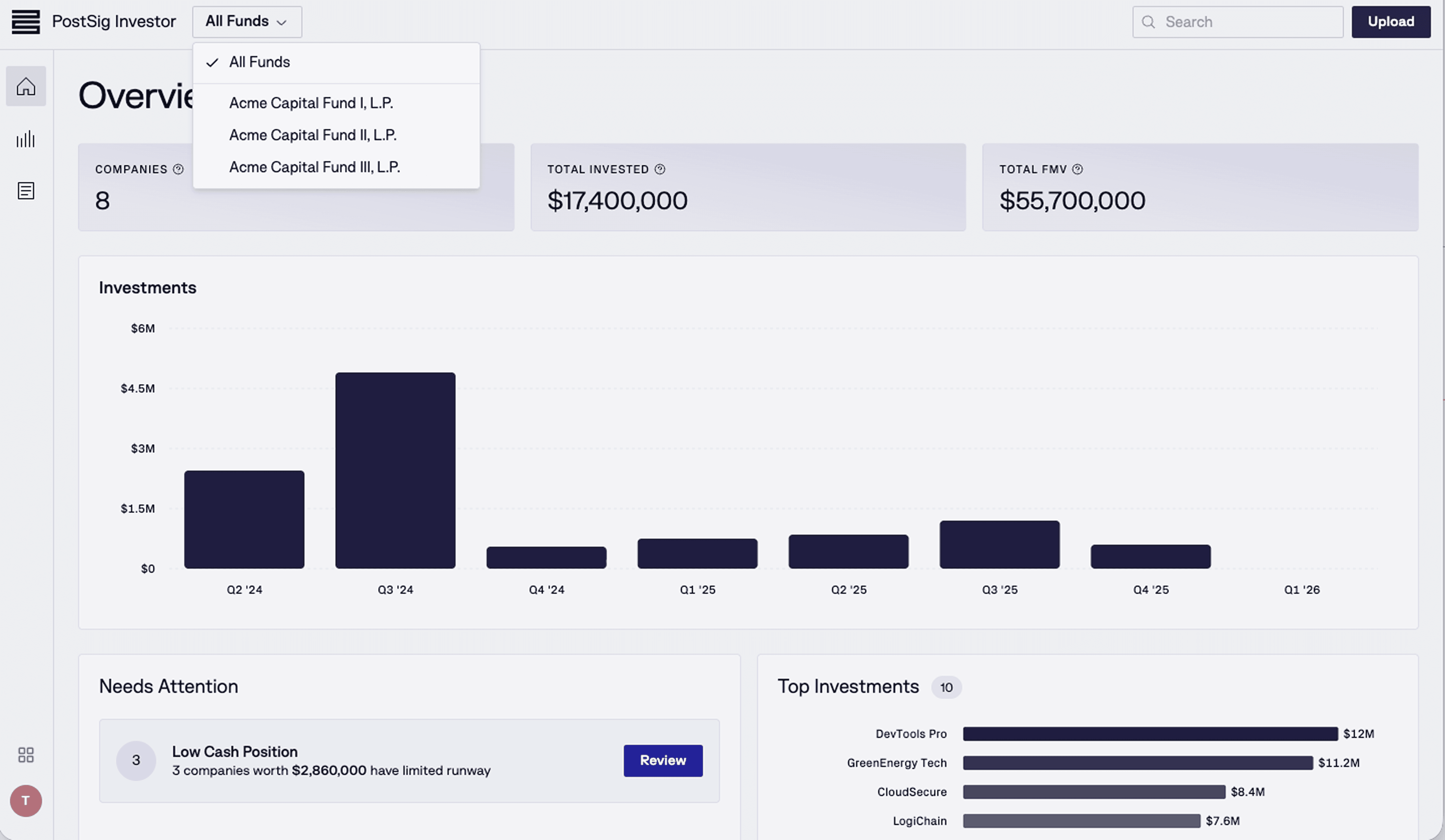 Manual tracking across 5 funds and 100+ companies is a logistical impossibility.